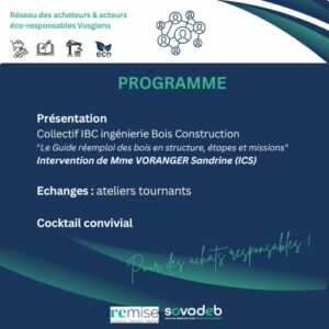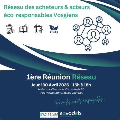 Nous avons le plaisir de vous inviter à la 1ère réunion du Réseau des acheteurs & acteurs éco-responsables Vosgiens ! 📅 Jeudi 30 avril 2026 🕓 De 16h à 18h 📍 Maison de l’Économie Circulaire (MEC) Rue Nicolas Berry, 88150 Chavelot